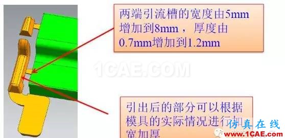 两端引流槽的宽度由5mm增加到8mm ,厚度由0.7mm增加到1.2mm;引出后的部分可以根据模具的实际情况进行加宽加厚。