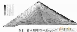 图5、图6分别给出了施工期和蓄水期堆石体应力水平等值线。施工期堆石区的应力水平小于0.65(相当于65%),沿上、下游坡面附近区域堆石区的应力水平稍高。蓄水后,由于面板的作用,上游坡面附近和主堆石区的应力水平有不同程度的降低,而下游坡面附近堆石区的应力水平略有所上升,坝基附近的堆石体应力水平基本呈降低趋势。