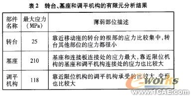 在进行限位过程中,冲击力还会对转台、基座和调平机构等部件的精度造成影响,有时可能是破坏性的,而转台、基座和调平机构的精度直接关系着光电设备的跟踪测量精度,因此对相关部件进行有限元分析确定冲击对其的影响是十分有必要的。分别对转台部件和基座组件进行有限元建模,在对垂直轴系最大速度限位的情况下分别进行分析,分析结果如表2 示。作用下,承受的最大应力都小于材料的抗拉强度,在材料的弹性的变化范围内,因此限位机构限位时不会对设备其他的部件造成破坏,对设备的精度影响不大。