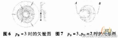 由文献可知,无轴承永磁同步电动机的气隙磁场主要是永磁体产生的磁场。根据上面给出的二维有限元模型,首先对无轴承电动机内部复杂的磁场进行分析研究,验证无轴承电动机运行原理。当转矩绕组加上三相电流,而径向力绕组不通电,可以看出此时磁场呈四极分布。然后转矩绕组不通电,而径向力绕组加上三相电流,此时电机内部磁场呈6极分布,如图3所示。将两套绕组同时通电,则电机内部的磁场就发生变化,与文献提到的无轴承电机原理相同,根据麦克斯韦力产生原理可以得知:此时电机中确实产生了径向力,如图4所示。从上面的分析可以看出:径向力绕组气隙磁场打破了四极电机转矩气隙磁场的平衡,使得在A点处的磁场减弱,而在对应的B点处磁场得到增强,根据电磁场的基本理论得知,此时确实产生了由A指向B的径向力。从内部磁场矢量图5~图7中更为直观地看出内部磁场由于相互叠加而产生径向力的原理。