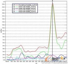 鉴于顶棚振动较大,所以对顶棚进行结构优化,达到抑制其振动的目的。 通过对加减速工况分析,顶棚减振效果非常明显,如图5所示为顶棚部分位置振动抑制效果(蓝色为原信号,红线为改进后信号),从图中可看出,特别是在3900~4100rpm转速范围的二阶振动幅值抑制最为明显,振动将近减少了一倍。总之,通过对顶棚结构的改善,有效地降低了顶棚的振动辐射,尤其是二阶振动辐射。
