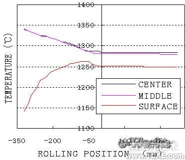 下面是有限元计算得到的结果,其中次轧件在第一和第二道被压下处各点的温度分布如图8所示,并计算得到了轧辊的温度变化,这些结果对生产设计起到了指导作用。