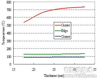 以上的分析表明虽然板坯的初始状态对残余应力的产生有一定影响,但水冷阶段的不均匀冷却才是主要原因。对于厚板,这种水冷的不均匀性要大于薄板。具有不同厚度、凸度为1mm、初始温度不均匀分布的板坯10s水冷后的温度分布情况如图2-c所示。随着板厚的增加,边部和角部的温度并没有明显的变化,然而心部的温度却从535℃变到了735℃。这种由板坯厚度引起的温差要远远大于由初始温度和凸度引起的温差,将导致板坯中产生较大的残余应力。