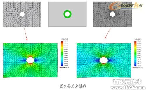在图9中,左上图为预设的网格,我们可以发现在中间圆孔周围的元素,与其他区域都一样;左下图为分析后看到圆孔的边缘变形与结果颜色的分布,均呈现块状;中上图与右上图在圆孔周围加入分模线与网格套用控制。我们可以看到圆孔周围的元素都被细致化,进而得到右下图较平顺的分析变形结果与应力分布。