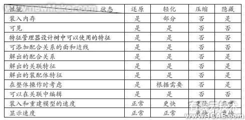 压缩状态:零部件的模型信息暂时从内存中清除,零件功能不再可用也不参与运算;