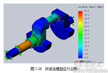 对改进后的模型运行静力分析,结果如图1-26所示:最大von Mises为42.9MPa,安全系数约5.1,零件是安全的。