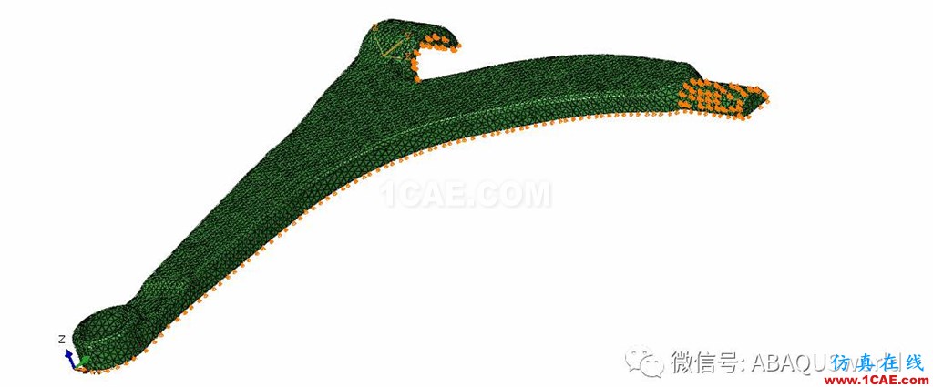 优化目标: 使用ABAQUS优化模块通过在最大化其刚度的同时减小控制臂的体积来优化汽车控制臂的设计。 应用说明: 汽车控制臂的拓扑优化。 在拓扑优化过程中,修改设计区域中单元的材料属性(有效地从Abaqus分析中除去单元或添加单元),直到达到最佳解。 几何模型: 汽车控制臂模型是二次四面体(C3D10...