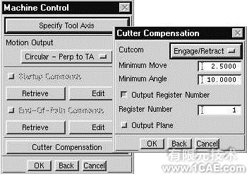 为了补偿指定刀具直径和实际刀具直径之间的差别, 几乎所有数控系统都提供了刀具直径补偿的功能,以 保证被加工零件的准确尺寸。 在UG的 Planar Mill, Cavity Mill 和WireEDM操作中,你可以激活如下菜单: 通过选择以上菜单,你可以设置刀具直径补偿。 有些数控系统对激活刀具直径补偿有一定的限制,如不允许把刀补...