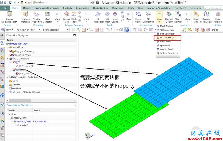在Nastran中,CWELD单元是一种0维单元,用于模拟焊接。 创建CWELD单元有以下要点: 1、焊点位置。 2、被焊接件分别具有不同的Property属性。 3、焊接属性(材料、焊点直径)。 4、焊点不得超出被焊接的两个面的边界。